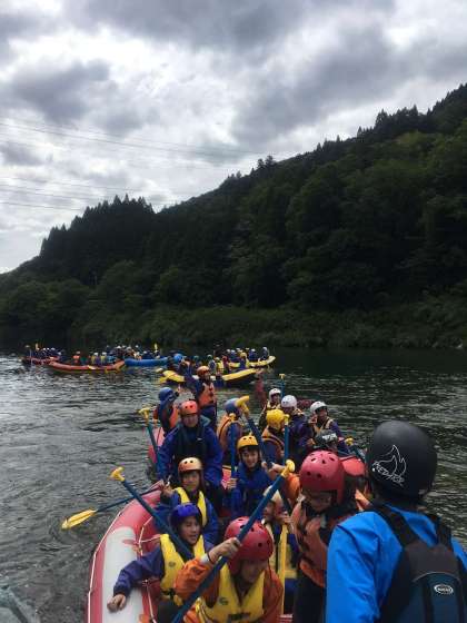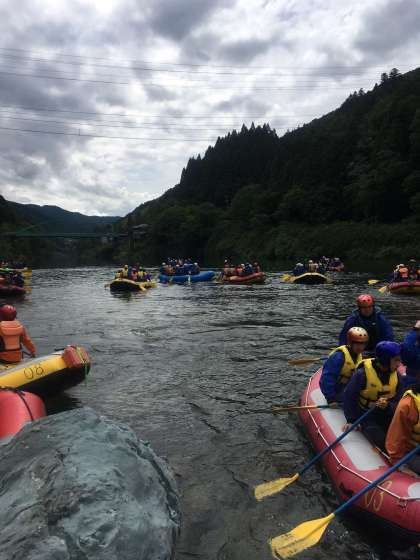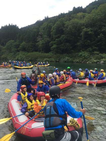 港中学校クルーたち、吉野川ラフティング船出です。