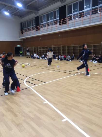 二人一組で背中でボールを運ぶ、ボール運びリレー、