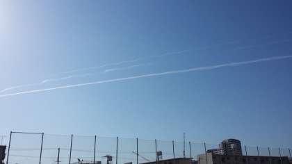 入学式直前に上空を見上げると、きれいな飛行機雲