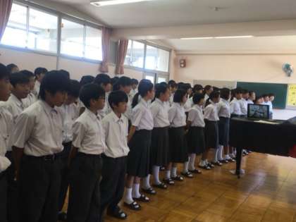 音楽室での練習、朝の学年集会での練習を精一杯頑張っています。