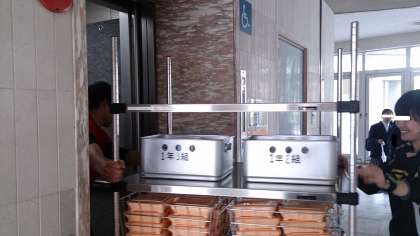 4時間目の終了前に1年生の先生を中心に管理作業員さんにも手伝ってもらい、毎日給食の準備をしています。専用の台車に給食を乗せ、1年生の各教室前に運んでいます。