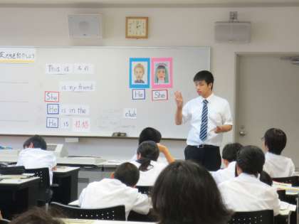 がありました。授業内容は「He (She)is 〜.」を学習していました。