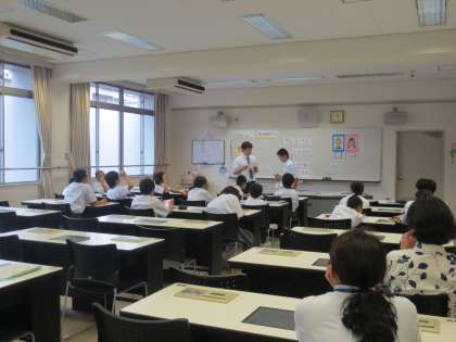 絵カードなどを準備し、生徒どうしで会話をしながら楽しく英語の授業をしていました。
