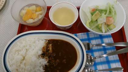 (写真は、片方の寮の夕食です。「ハヤシライス」「アボカドサラダ」「フルーツパンチ」というメニューでした。)