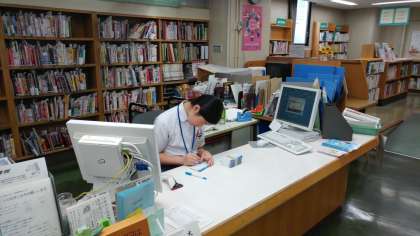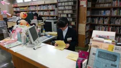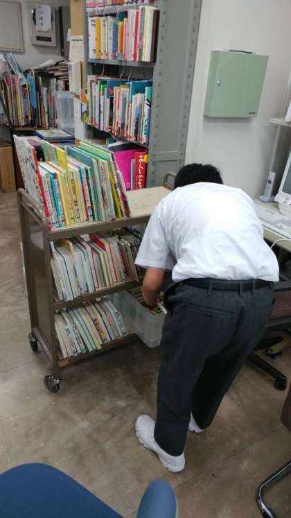 受付と本棚へ本を1冊1冊確認しながら入れていく作業です。