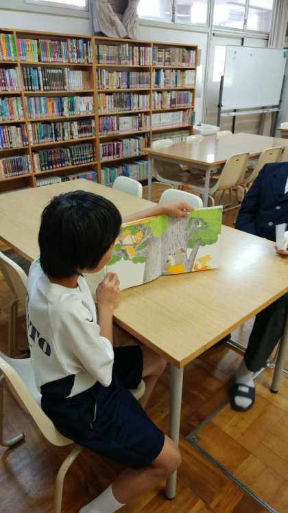 出発が遅い事業所は図書室で待機、保育園で読む絵本の練習をしています。