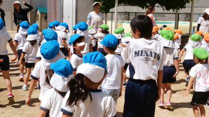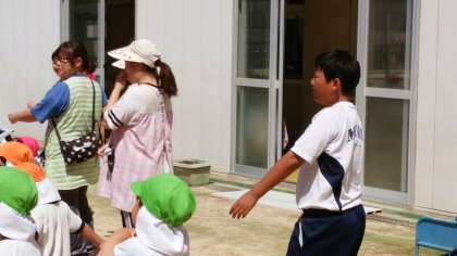 港中学校2年生、やさしいお兄さん、お姉さんになって体験中です。