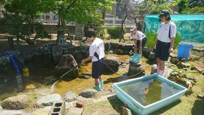 今は池の掃除を手伝っているところです。