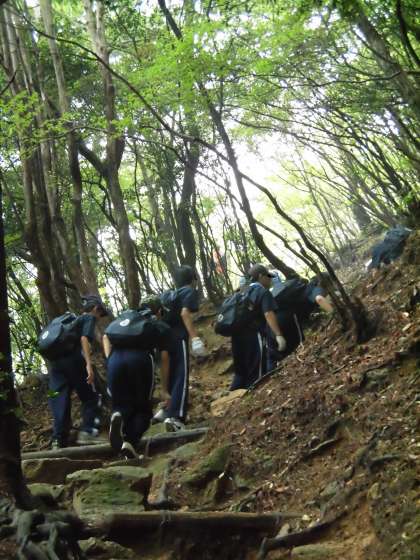 6月7日(土)に中学校体育連盟主催の登山大会があり、港中学校野外活動部も参加しました。新神戸駅に9時に到着し、集合場所の市が原まで3.7km登りました。10時の開会式の後、5分おきに学校別に出発です。午前中に早くも雨が降り出し、カッパを着ての登山となりました。頂上しか雨宿りするところがなく、全員びしょぬれになりながら、頂上を目指しました。摩耶山頂での昼休憩時に、着替えもして、午後からはトゥエンティークロスというきれいな沢を何度も渉るコースを歩きました。何とか5時間以内で市が原にゴールすることができ、全員合格証をいただきました。解散後、新神戸に向かって約1時間、新緑を眺めながら下山しました。行きには気付かなかった神戸の超高層ビル群と海が目の前にありました。