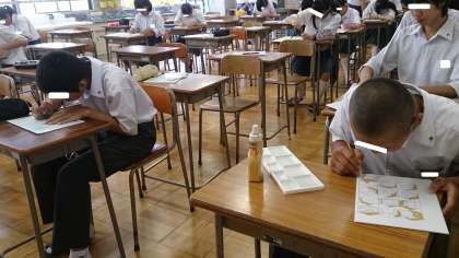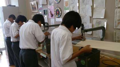 木の板を切ったり、金色の絵の具で塗ったりしています。