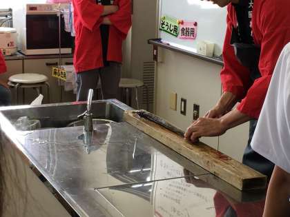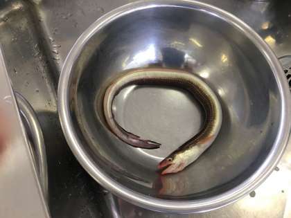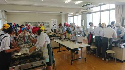 毎年、あなご加工業の方々に来ていただき、ウナギとの違いやさばき方などを教えていただきました。特にさばく実演(開き・ひれ取り・串うち・ヌメリとり)では、生徒が釘づけになっていました。