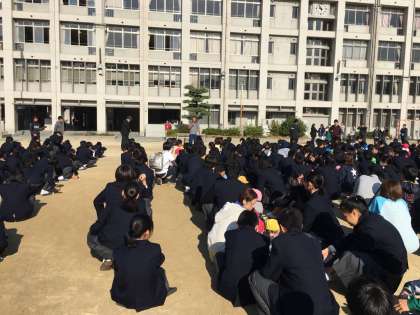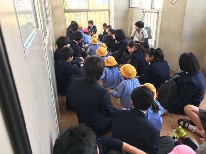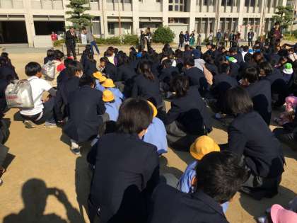地震を想定した避難後、津波警報発令で3階以上に避難し、最後に運動場に集まって、校長先生より講話をいただきました。