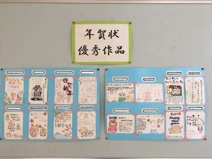 1年国語の冬休みの宿題である年賀状の優秀作品が学年のフロアに掲示されました。