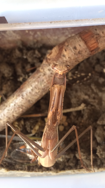 港中学校には、将来カマキリ等の昆虫博士を目指している生徒がいます。カマキリを校長室にプレゼントしてくれました。食べ物は、バッタなどの虫だそうです。種類は、チョウセンカマキリでメスです。大事に育てますけど、寿命を聞くと六か月ということです。一日一日大切に過ごさせてあげたいです。
