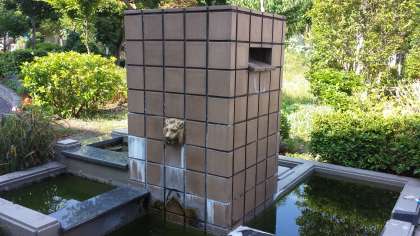 正門をくぐり花壇の左側に足を進めると格技室があります。その手前に小池があり、そして、目に映るのがライオンの造形物、口からは水が出ていて池の浄化や美観を整えるような雰囲気があります。