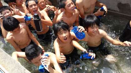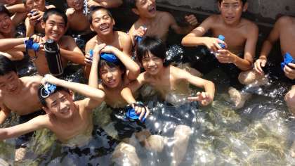 午後1時20分 洗体槽につかり大きな声で「10秒数える」さすが一年生,町中に轟く大声、雄叫び。大会を盛り上げてください。