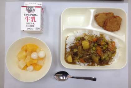 カツカレーライス、フルーツ白玉、牛乳です。入学祝い献立との事です。