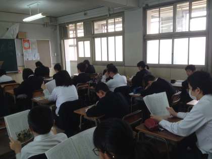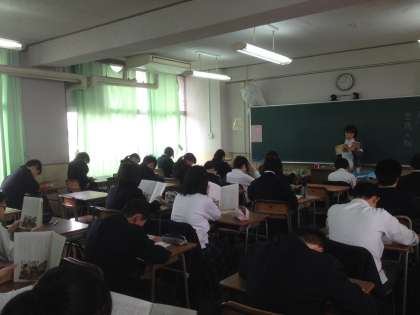 1限、道徳の時間です。学年で同一展開の授業です。担任の先生が解説しながら、役になりきりながら、音読しています。