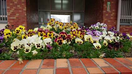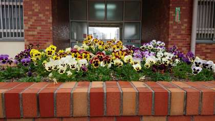真っ先に正門のパンジーがお出迎え。