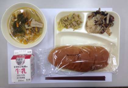 金時豆の中華おこわ、中華スープ、ツナと野菜のオイスターソース炒め、黒糖パン、牛乳です。