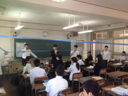 16m程のヒモをつかって、縄文杉の直径を実感しています。