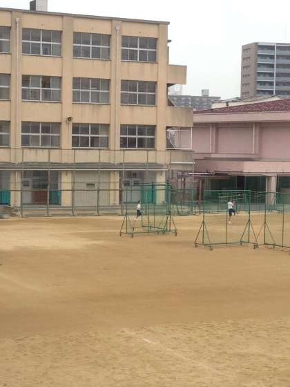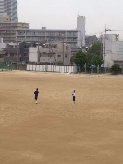 午前7時、野球部はグランドで、バスケ部は体育館で練習準備をしています。