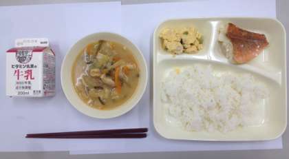 赤魚のしょうゆがけ、みそ汁、エンドウの卵とじ、ごはん、牛乳です。
