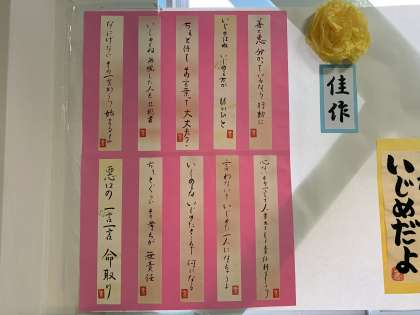 全校生徒にいじめについての標語を募集し、それについて生徒会役員で、最優秀賞・優秀賞・佳作と選び、校長先生にも特別賞を選んでいただきました。