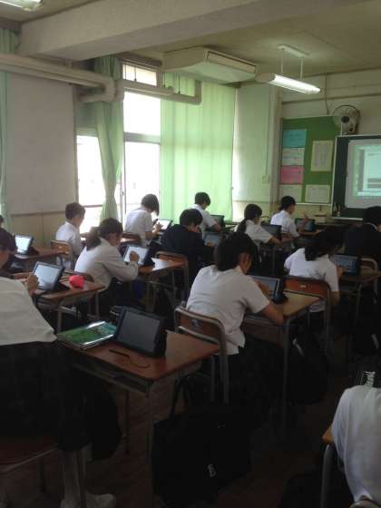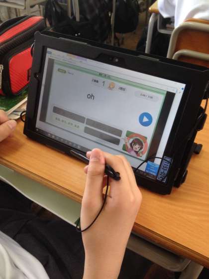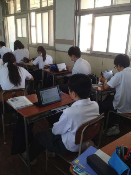 写真は生徒全員がタブレットによる英語ドリルをおこなっているところです。