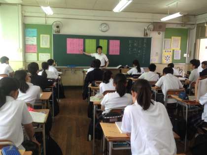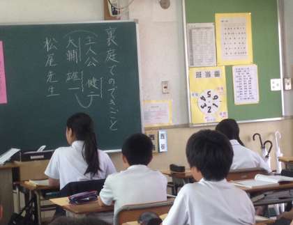 黒板に、文章の一部と発問を掲示しているので、生徒たちは顔をあげて考えています。