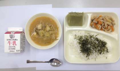 鶏肉とチクワの混ぜごはん、みそ汁、抹茶のういろう、牛乳です。