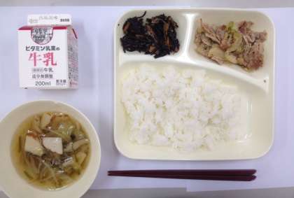 豚肉のごまだれ焼き、五目汁、ひじきの炒め、ご飯、牛乳です。