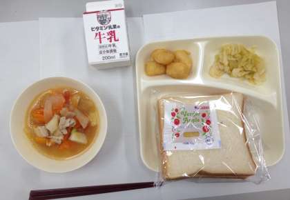 イカの天ぷら、トマトと鶏肉とジャガイモのスープ、キャベツのソテー、食パン、リンゴジャム、牛乳です。