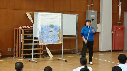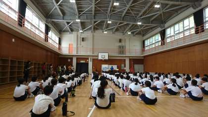 日高に到着し、入所式を終え、施設の利用の仕方と海の活動の説明を聞いています。みんな真剣です。