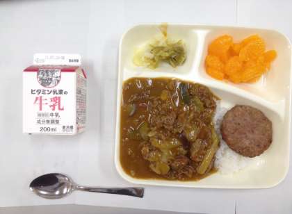 夏野菜のカレーライス、焼きハンバーグ、キャベツのサラダ、みかん(缶詰)、牛乳です。