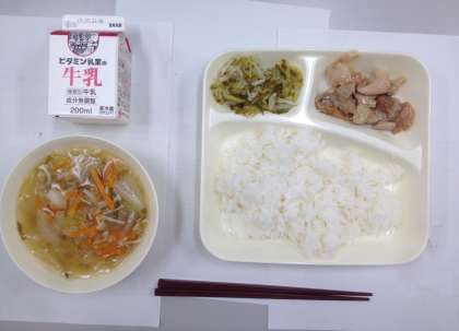 鶏肉のしょうゆマヨネーズ焼き、五目汁、切干大根の柚子香りあえ、ご飯、牛乳です。