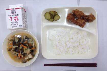 豚肉の唐揚げ、みそ汁、きゅうりの甘酢づけ、ご飯、牛乳です。