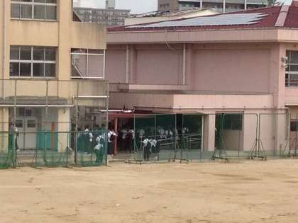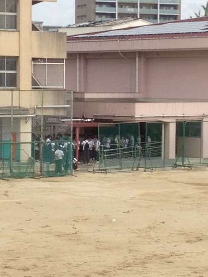 気温は32度です。久しぶりの登校で、体育館に集まっています。