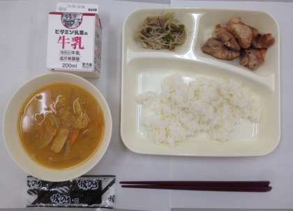 ごはん、牛乳、鶏肉の照り焼き、みそ汁、野菜いため、焼きのり です。