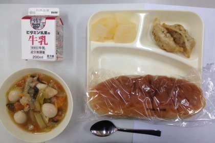 さつまパン、牛乳、揚げ餃子、中華煮、和梨 です。