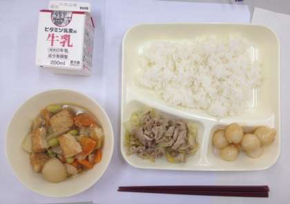 ごはん、牛乳、鶏肉とサトイモの煮物、豚肉とキャベツの炒めもの、みたらし団子 でした。