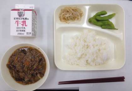 ごはん、牛乳、麻婆豆腐、もやしのゴマ酢あえ、えだまめ です。