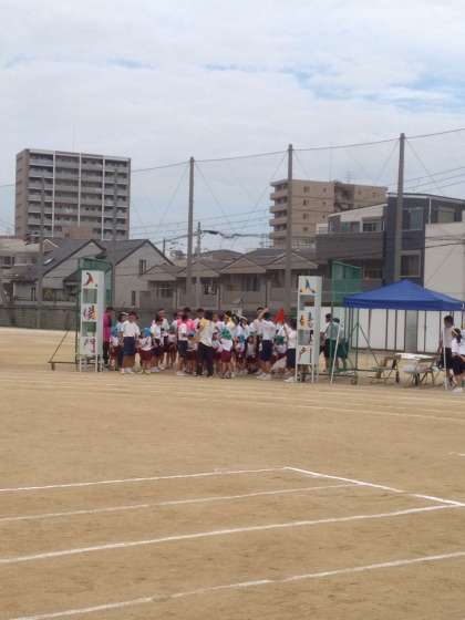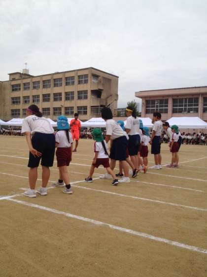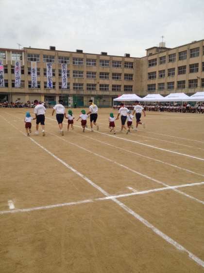 三先幼稚園の園児と3年生の委員長と全学年の体育委員らとのかけっこです。