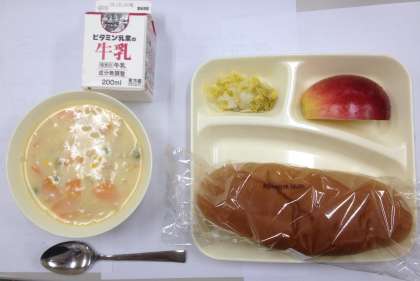 黒糖パン、牛乳、コーンクリームシチュー、白菜のピクルス、りんご です。