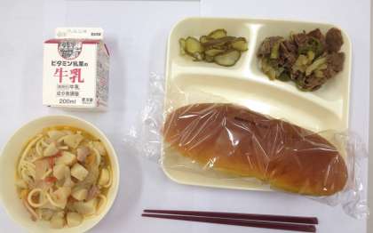 かぼちゃパン、牛乳、牛肉のカレー風味焼き、トマトと貝柱のスープスパゲティ、きゅうりのピクルス です。