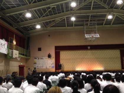 展示発表の連絡です。写真では家庭科部がアナウンスしています。
