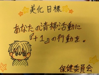 今月の目標は『あなたの清掃活動に「+1」の行動を』です。いつもの清掃活動に+1つ何かのためになる行動をし、校舎がもっときれいになるように意識しましょう!