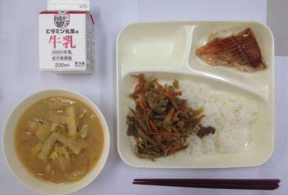 赤魚のしょうゆだれ、みそ汁、きんぴらゴボウ、ごはん、牛乳 です。