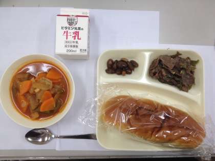 牛肉の香味焼き、ケチャップ煮、うずら豆のグラッセ、さつまパン、牛乳 です。