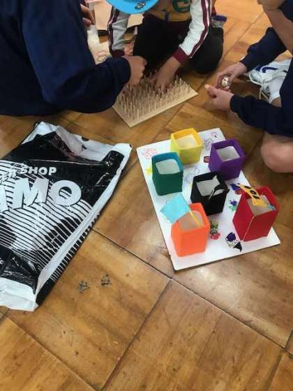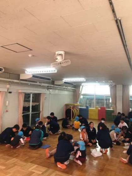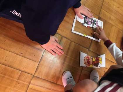 家庭科の時間に作ったおもちゃやゲームを園児と一緒に遊びました。